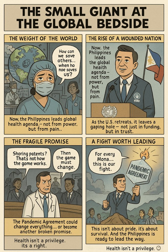 IN A cramped Manila hospital in 2020, Nurse Mona Santos worked 18-hour shifts, her face bruised from a too-tight mask, tending to COVID-19 patients while fearing for her own children. She wasn’t alone: Filipino health workers, often underpaid and overworked, became the backbone of a nation battered by a global crisis that exposed stark inequities in healthcare access. Today, as the Philippines, under Health Secretary Teodoro “Ted” Herbosa, assumes the presidency of the 78th World Health Assembly (WHA78), Mona’s story embodies the moral weight of this historic moment. For the first time since the World Health Organization’s founding in 1948, a developing nation scarred by pandemic inequity is steering the global health agenda. Yet, the irony stings: as the Philippines rises, the United States retreats, leaving a fractured world to grapple with health equity amid geopolitical storms.