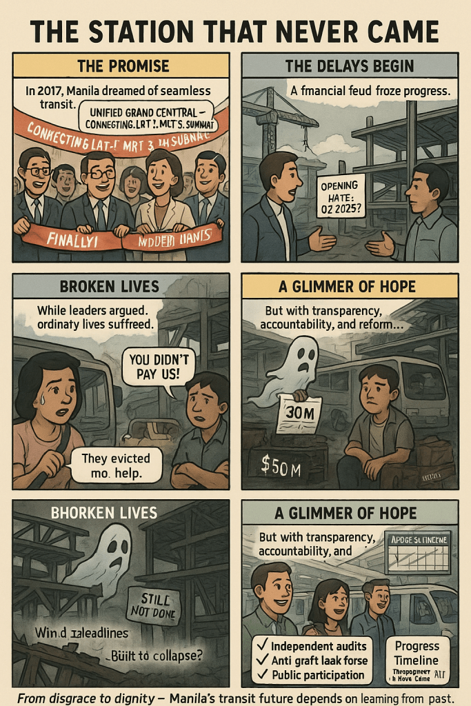 The UGCS’s rusting frame betrays millions like Kathy Cruz and Juan dela Cruz. Yet, it’s a chance for redemption. By tackling financial disputes, design flaws, and corruption with transparency, the DOTr can turn this disgrace into a triumph. Manila’s commuters deserve a station that delivers them home—not a monument to failure.