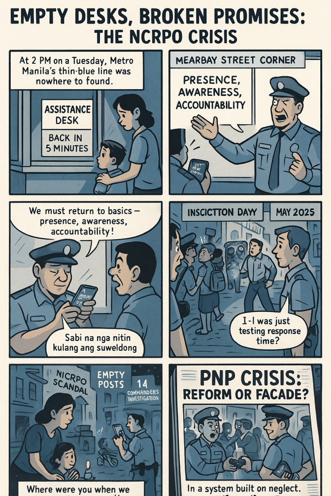 THE police assistance desk sits empty at 2 PM on a Tuesday afternoon in Quezon City. Down the street, another officer scrolls through mobile games while his post remains unmanned. This isn’t an isolated incident—it’s the norm that 13 million Metro Manila residents have learned to accept. But on May 17-18, 2025, surprise inspections by the National Capital Region Police Office finally pulled back the curtain on a public safety crisis that has been hiding in plain sight. With 14 commanders now under investigation and Major General Anthony Aberin promising a purge of negligent officers, the Philippine National Police faces a moment of reckoning that could determine whether millions of Filipinos can ever truly feel safe in their own city.