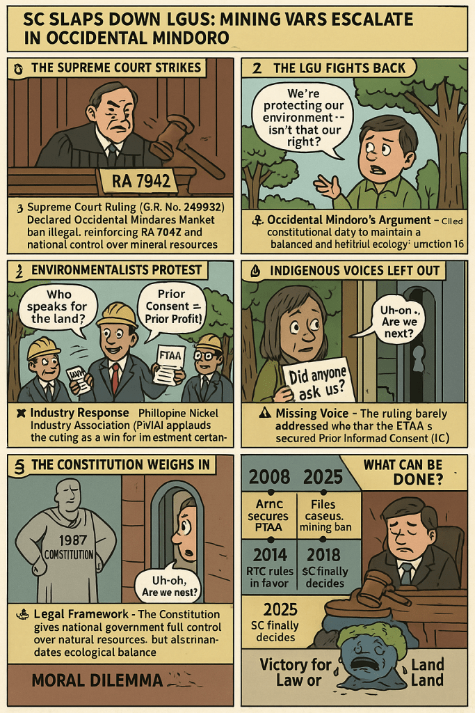 THE Supreme Court’s January 14, 2025, ruling—dropped like a bombshell on May 14—obliterated Occidental Mindoro’s 25-year ban on large-scale mining, cementing the state’s iron-fisted control over mineral riches. Penned by Senior Associate Justice Marvic Leonen in G.R. No. 248932 (SC Decision Summary), the 31-page decision brands the province’s ordinances as illegal overreach, trampling the Philippine Mining Act of 1995 (RA 7942) and the 1987 Constitution. This critique rips into the ruling’s legal guts, its precedent pedigree, the stakeholder firestorm, procedural hiccups, and bold next steps, questioning whether the Court fortified national order or sold out local ecosystems.