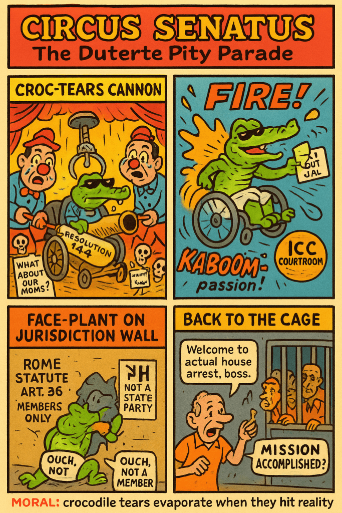 MGA ka-kweba, gather ’round the circus tent that is the Philippine Senate, where ou0r esteemed solons have just staged a performance so brazen, so dripping with irony, it could make a carabao weep from second-hand embarrassment. Senate Resolution No. 144, a pathetic plea to the International Criminal Court (ICC) to grant former President Rodrigo Duterte house arrest, isn’t just a legal nullity—it’s a soap opera of sovereign shame, a masterclass in political coddling dressed up as humanitarian concern. With all the legal force of a strongly worded Yelp review, this resolution is a grotesque display of the Philippine elite’s enduring love affair with impunity. Let’s dissect this travesty with a scalpel of precedent and a flamethrower of truth.