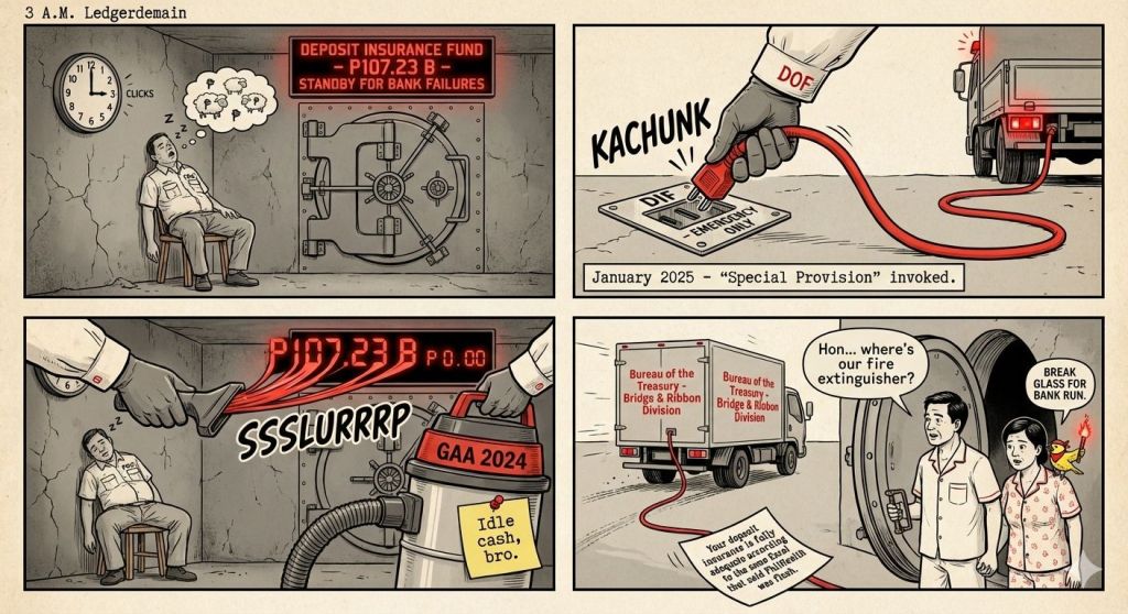In January 2025, the PDIC quietly wired P107.23 billion of its Deposit Insurance Fund straight to the Bureau of the Treasury. Official story: it was required by the 2024 General Appropriations Act and rubber-stamped by a secret OGCC legal opinion that still hasn’t seen daylight.
