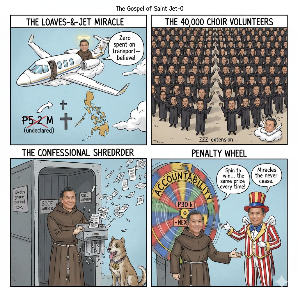 - The Comedy – COMELEC accepts the excuse that the dog ate P5.2 million worth of receipts, slaps a P30,000 fine, and everyone pretends democracy was served.