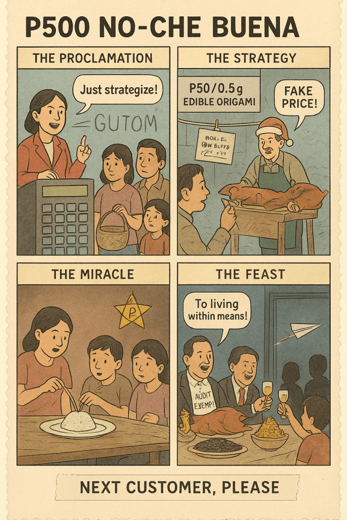 A real Filipino Christmas should not require a miracle of loaves, fishes, and P500. It should simply be the quiet dignity of a parent who does not have to explain why the ham is smaller this year, why tatay skipped dinner again, why there is nothing under the tree except promises.