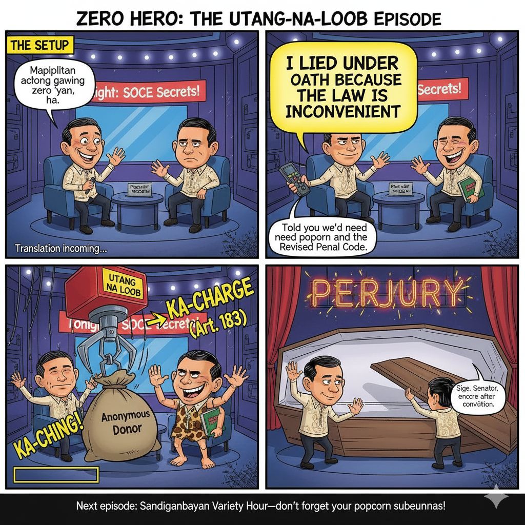 Let’s be crystal clear, mga ka-kweba: the moment you accept money to run for the Senate and agree to hide the source because “utang na loob,” you have just confessed to a textbook quid pro quo arrangement wrapped in cultural gift ribbon.
