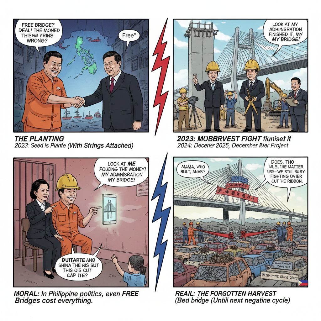 A bridge. Concrete, steel, 1.3 kilometers, P3.1 billion — and supposedly free. This should have been a simple good-news story: after decades of traffic hell in Davao finally ending with a new crossing to Bucana. But no, dear countrymen. In the Philippines, even a bridge must be turned into a telenovela.
