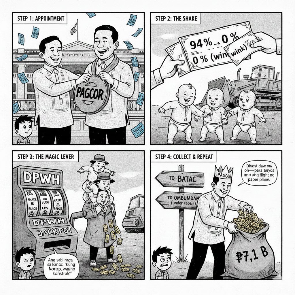 Absurd! Tengco insists PAGCOR doesn’t touch DPWH. But as GOCC head and Marcos BFF—confirmed at private parties, son’s wedding with Liza in attendance—he has informal sway. Phone call to the right ear in Malacañang? Whisper during lunch? That’s how cronyism works—no need for official letterhead. “Technical” no direct power vs. “substantive” ethical breach? The law and public demand the latter. This isn’t clean; it’s classic trapo—koneksyon over competence.