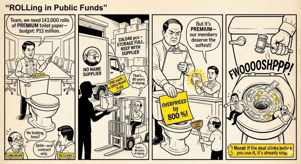 No public bidding was done for the multi-million procurement contract. Even the agreement was not in writing; it is just an oral contract and, apparently, nothing more. As of this writing, the name of the supplier of the very expensive toilet paper has not been revealed by de Claro.