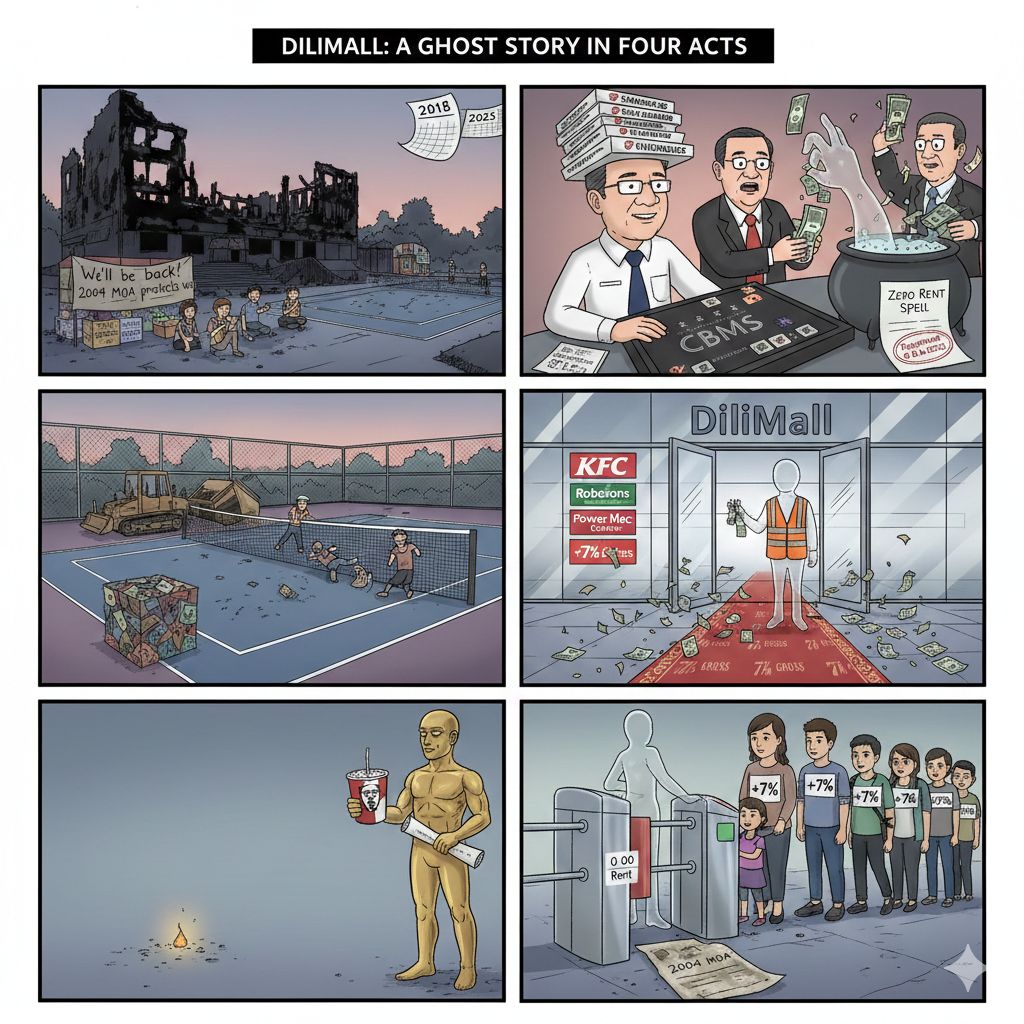 HAYY, the mighty University of the Philippines, proud fortress of fearless inquiry and champion of the masses, now moonlighting as a prime real estate playground for ghost entities and chain-store invaders. But behold the latest syllabus from the Jimenez administration: “Privatization 101: How to Hand Prime Public Property to Shadowy Insiders While Kicking Legacy Vendors to the Curb.” Starring President Angelo Jimenez, his predecessor Danilo Concepcion, and a chorus of enablers like Vice President Daniel Peckley and former Vice Chancellor Raquel Florendo, with cameo appearances by “ghost entities” like CBMS Property Company OPC—registered with the SEC a full month after inking the deal—and the ever-opaque JoseBizCo. The displaced vendors from the old Shopping Center? Mere extras, evicted from their tennis court limbo in April 2024, now facing exorbitant rents plus a 7% gross sales skim if they’re lucky enough to squeeze into the shiny new DiliMall.