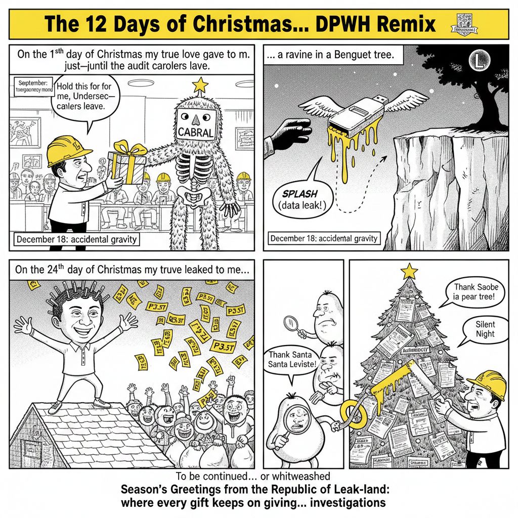 IN THE Philippines, the only thing more flooded than our streets after a mild drizzle is the national budget with suspicious “allocables.” Enter our two protagonists in this holiday-season farce: Batangas Rep. Leandro Leviste, the self-anointed whistleblower wielding a hard drive like Excalibur, and Department of Public Works and Highways (DPWH) Secretary Vince Dizon, the unflappable technocrat issuing denials faster than his department builds ghost dikes. Hovering between them? The ghost of the late Undersecretary Maria Catalina Cabral, whose untimely plunge into a Benguet ravine on December 18 left behind files that now threaten to drown the entire Marcos-era infrastructure circus.