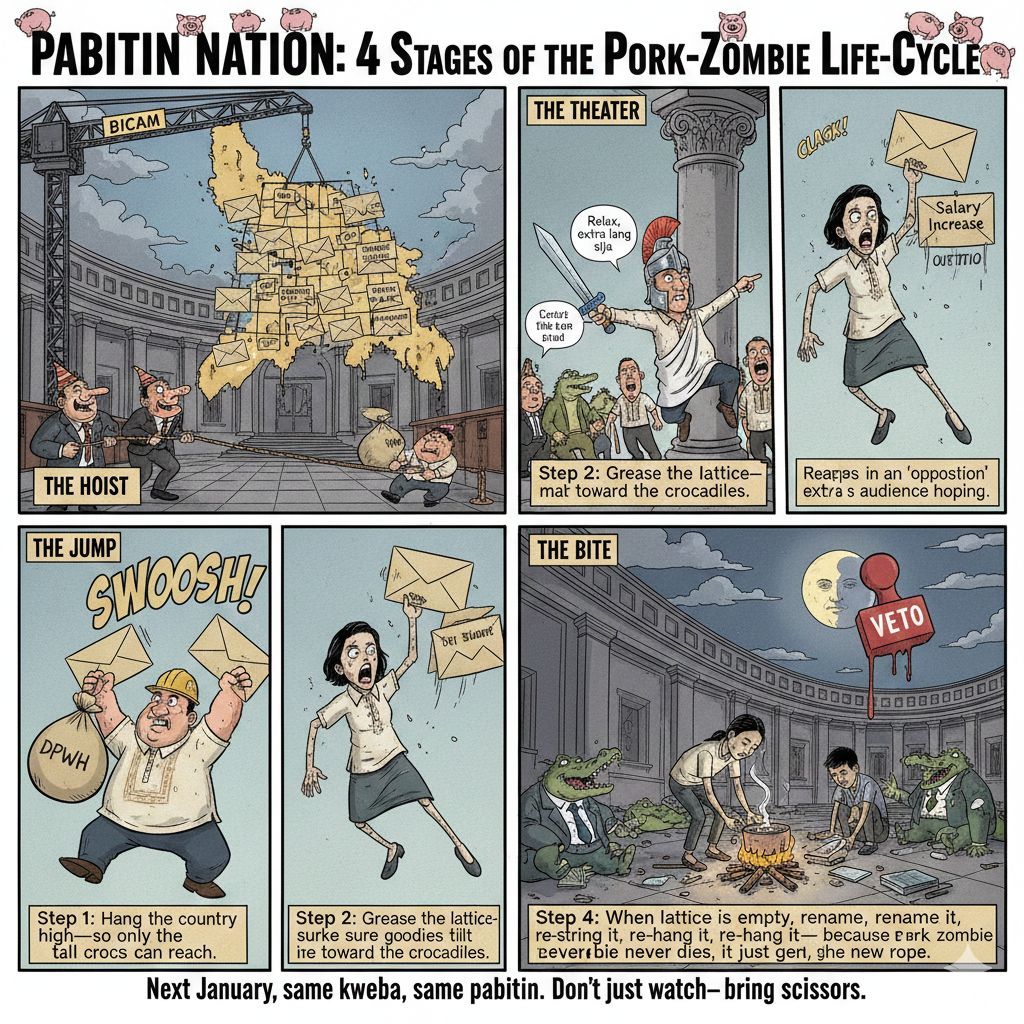 MGA ka-kweba, grab a seat and pour yourself a drink—beer or coffee, depending on the hour you’re reading this—because it’s that time of year again: the annual national ritual known as the passage of the General Appropriations Act (GAA). Every year, like a mass celebrated by hypocrites, Congress and Malacañang gather to carve up the P6.793 trillion budget for 2026. But make no mistake—this isn’t about public service. This is the Season of the Pork, the season when the people’s money becomes a pabitin mercilessly bashed by politicians until it rains envelopes, contracts, and kickbacks.