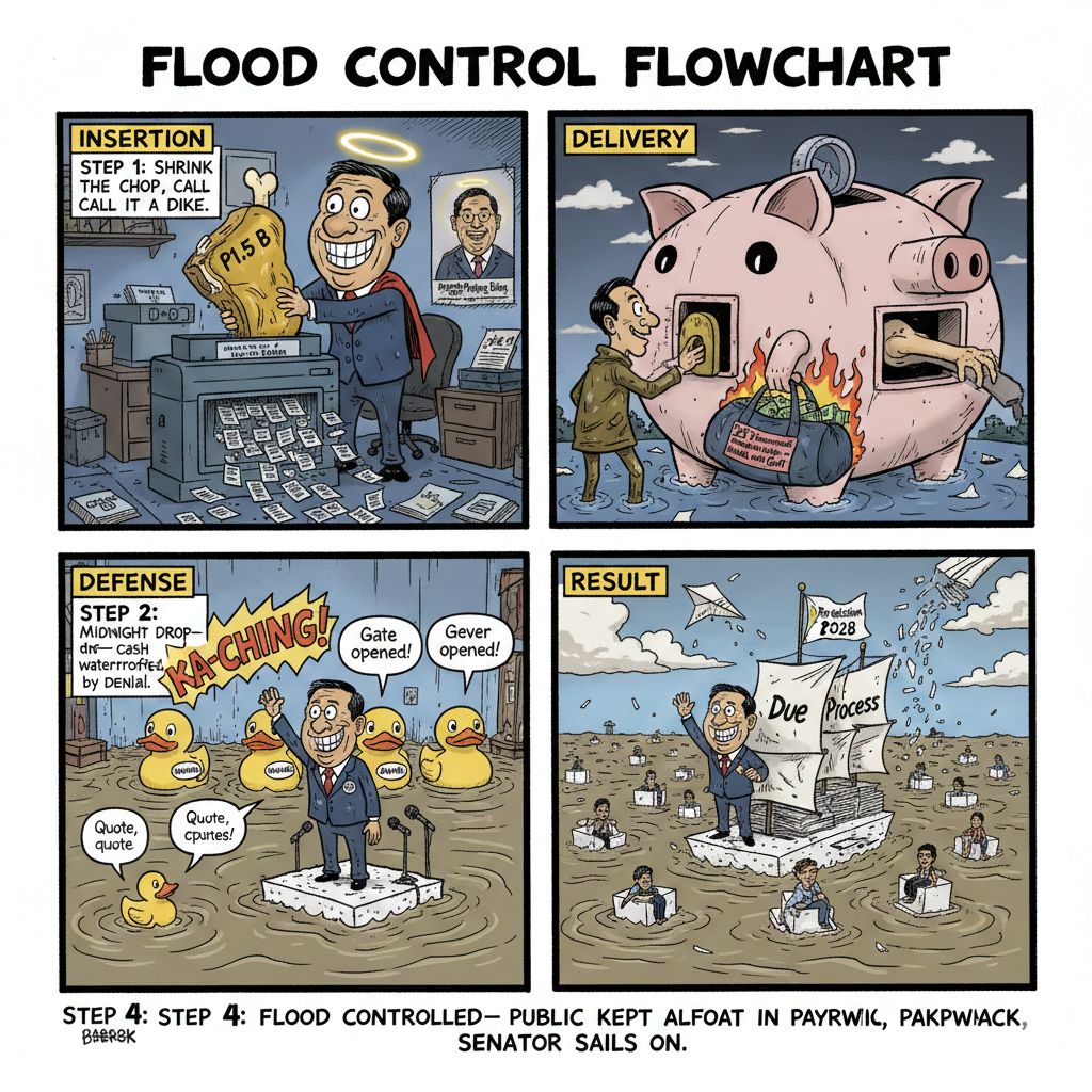 Crowning irony: Villanueva as anti-anomaly advocate, decrying flood control corruption. Yet accused of skimming hundreds of millions from it. How does one “hate” the swamp while wallowing in its undertow?