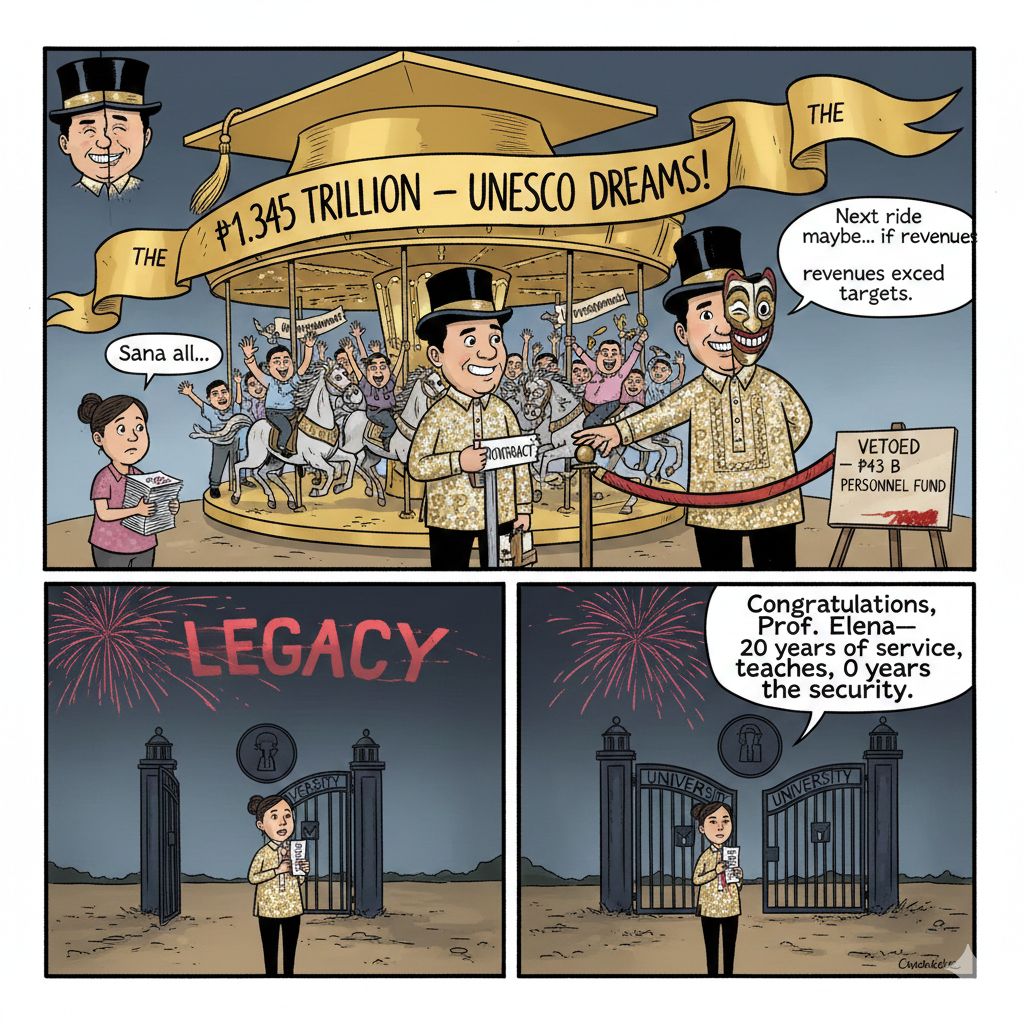 The contradiction? This veto comes from the very same administration that delivered a record-high education budget—P1.345 trillion, the first time the Philippines has met the UNESCO benchmark of 4–6% of GDP. The macro picture is grandiose, but at the micro level, it feels like building a palace while locking the cleaners and adjuncts in the basement.