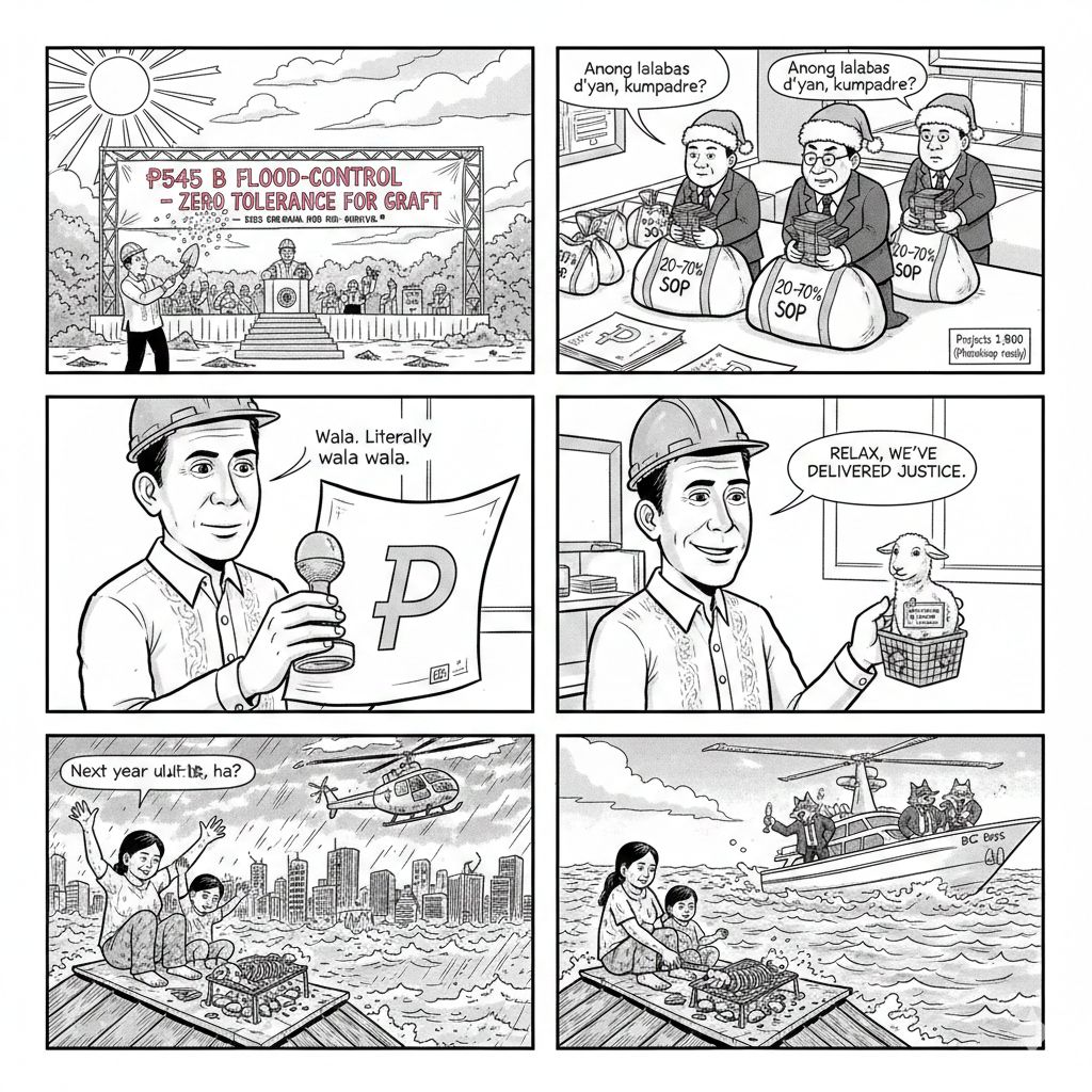 MGA ka-kweba, picture this: a country that drowns every rainy season. Children float to school on plastic basins. Families watch their homes disappear under filthy water year after year. Then imagine pouring ₱545 billion — half a trillion pesos — into “flood control” projects, only to find that most of it built nothing except phantom dikes, invisible pumps, and the offshore accounts of a privileged few.