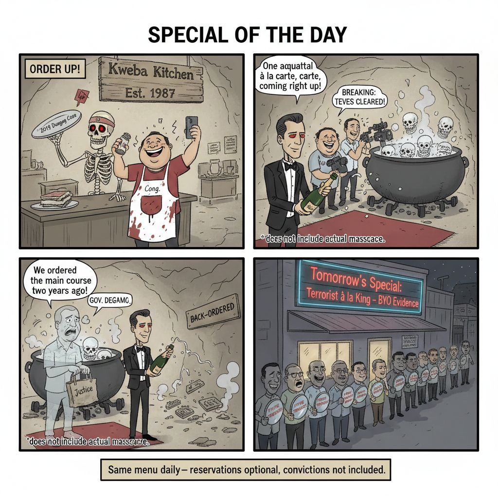 Drain your glass, sharpen your pitchforks, and never forget: justice delayed is impunity approved. Until the next corpse drops,