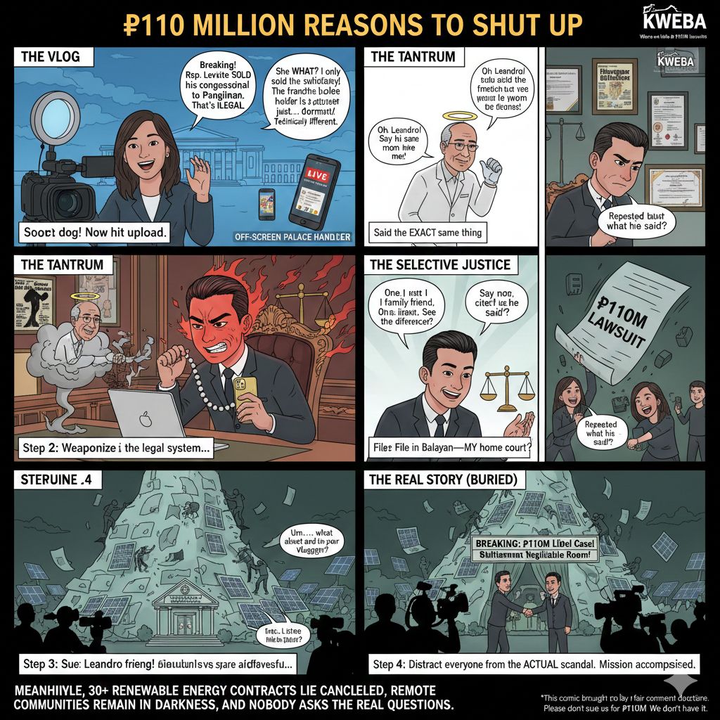 Legal Theater: Why civil libel in Balayan, not criminal cyberlibel under Republic Act No. 10175, the Cybercrime Prevention Act? Shrewd, mga ka-kweba. Criminal cyberlibel could jail Castro—bad optics when you’re suing a woman for talking too much. Civil keeps it “gentlemanly”: no handcuffs, just financial crucifixion. ₱110 million is not damages; it’s a death sentence by bankruptcy. A classic SLAPP suit—Strategic Lawsuit Against Public Participation—designed to terrify critics into silence without the mess of actual imprisonment. Leviste gets to play the aggrieved victim while wielding the law as a garrote.