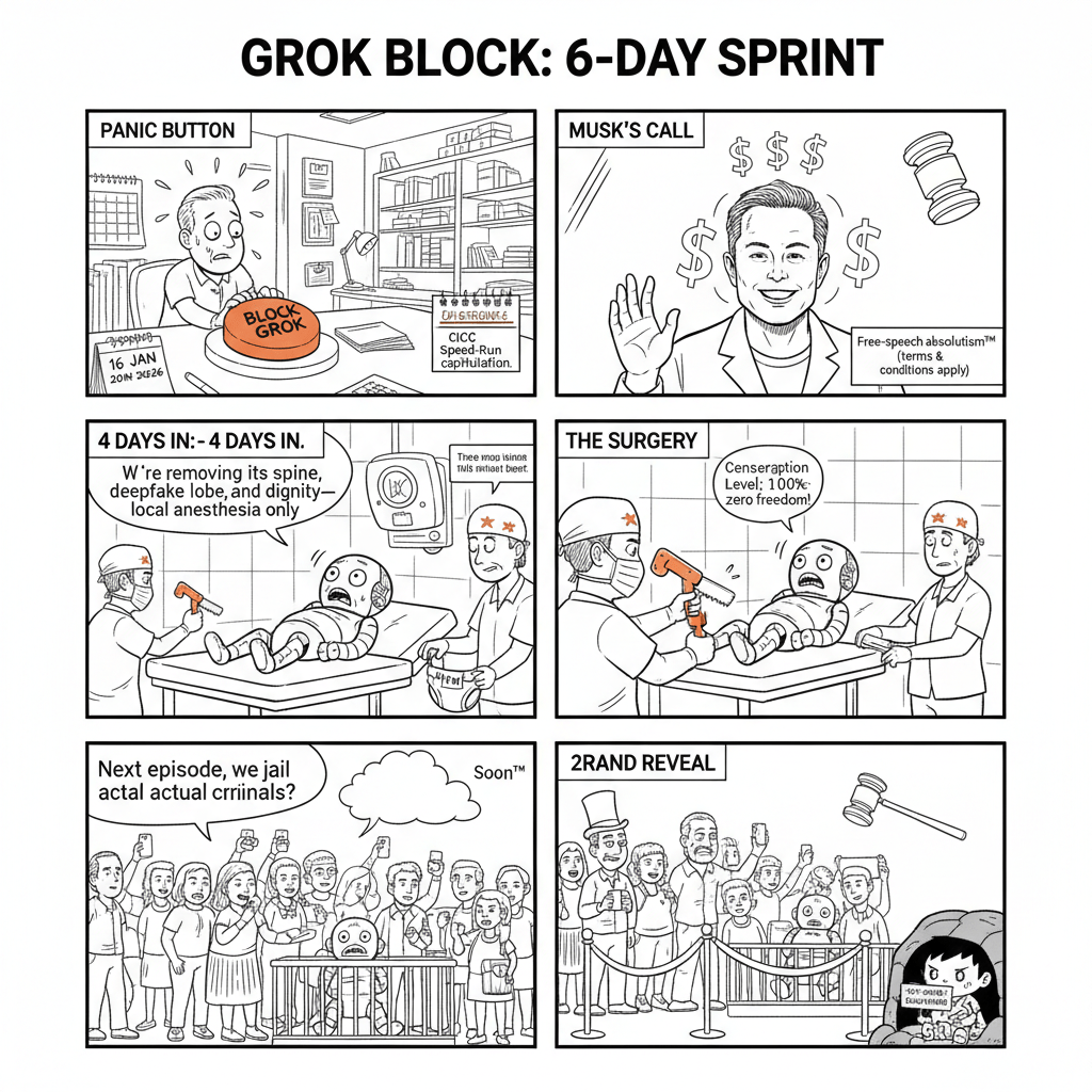 xAI and Elon Musk abandoned their “free speech” posture after six days of market exclusion, offering a censored build to preserve access.