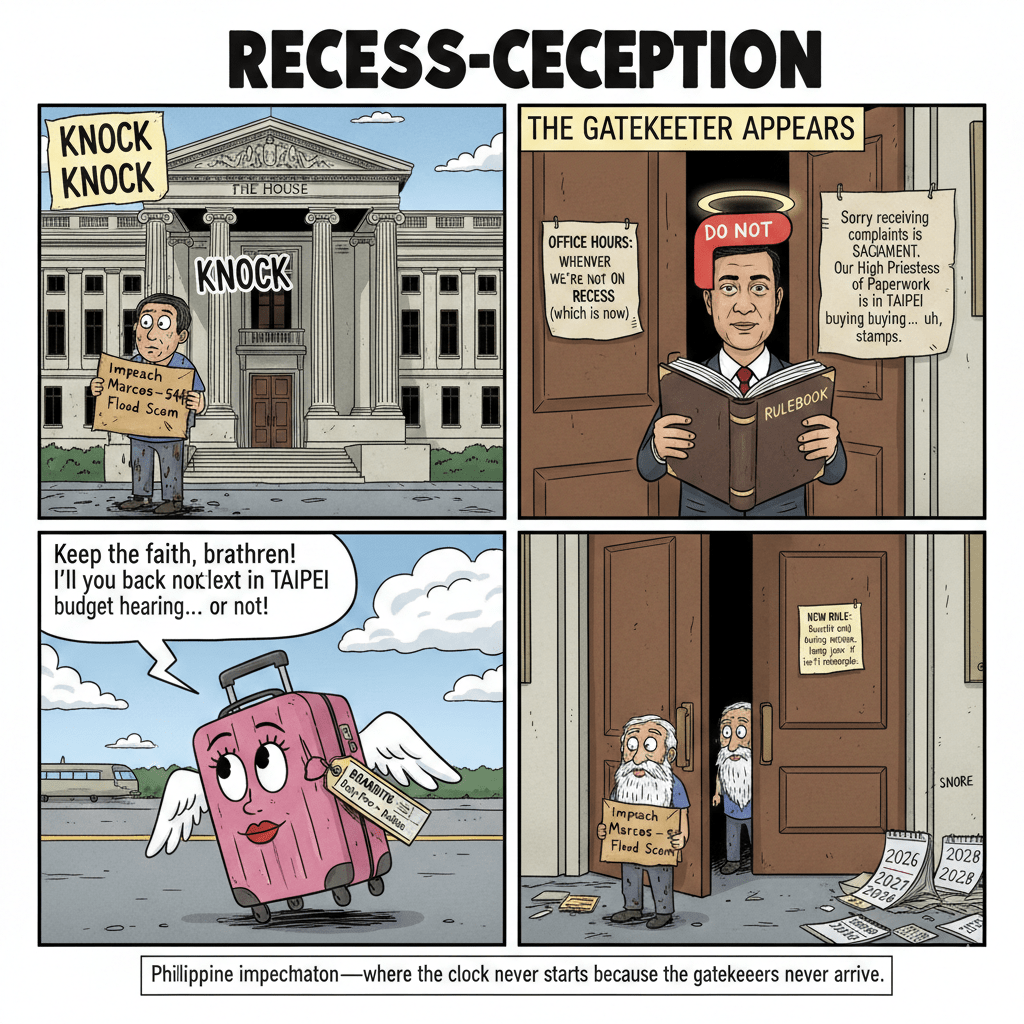 Mockery aside—though it’s richly deserved—ask yourself: Is our vaunted impeachment mechanism so brittle that it shatters at a “drop-off”? Adiong’s logic implies yes, reducing Article XI of the 1987 Constitution to a suggestion rather than a command. The House Rules he clutches like a talisman specify receipt by the Secretary General for verification of completeness, endorsements, and form. Fair enough, but what happens when she’s AWOL? Apparently, nothing. This isn’t prudence; it’s a procedural pantomime designed to evade action. In the “Great Receipt Standoff,” democracy waits politely while the “Walk-In That Wasn’t” exposes how the House treats constitutional duties like an optional errand.