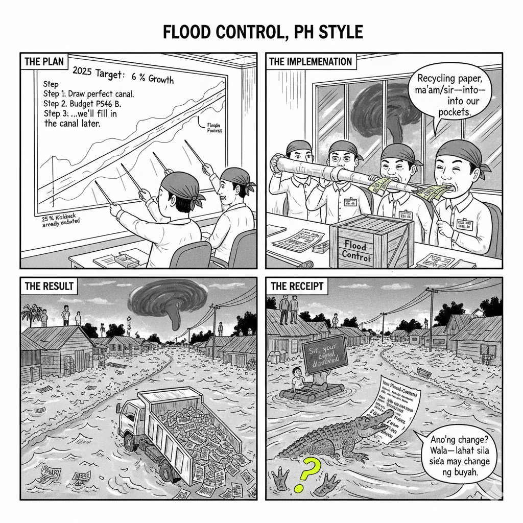 What the headlines politely call “flood control irregularities” is, in plain language, one of the most brazen, systematic heists in recent memory. Since 2022, the government rolled out 9,855 flood control projects worth roughly P546 billion. A staggering portion of that money—estimates suggest annual losses of P42.3–118.5 billion since 2023—vanished into thin air or into the pockets of the connected. Audits and Senate inquiries laid bare the playbook: ghost projects that existed only on paper, substandard materials that crumbled at the first rain, costs inflated beyond reason, and kickbacks routinely pegged at 25% per contract. The collusion was almost elegant in its shamelessness: lawmakers doubling as contractors, DPWH engineers signing off on fiction, private firms funneling campaign donations back to their political patrons. It was less infrastructure development and more a masterclass in cynical entrepreneurship—disaster turned into a profit center.