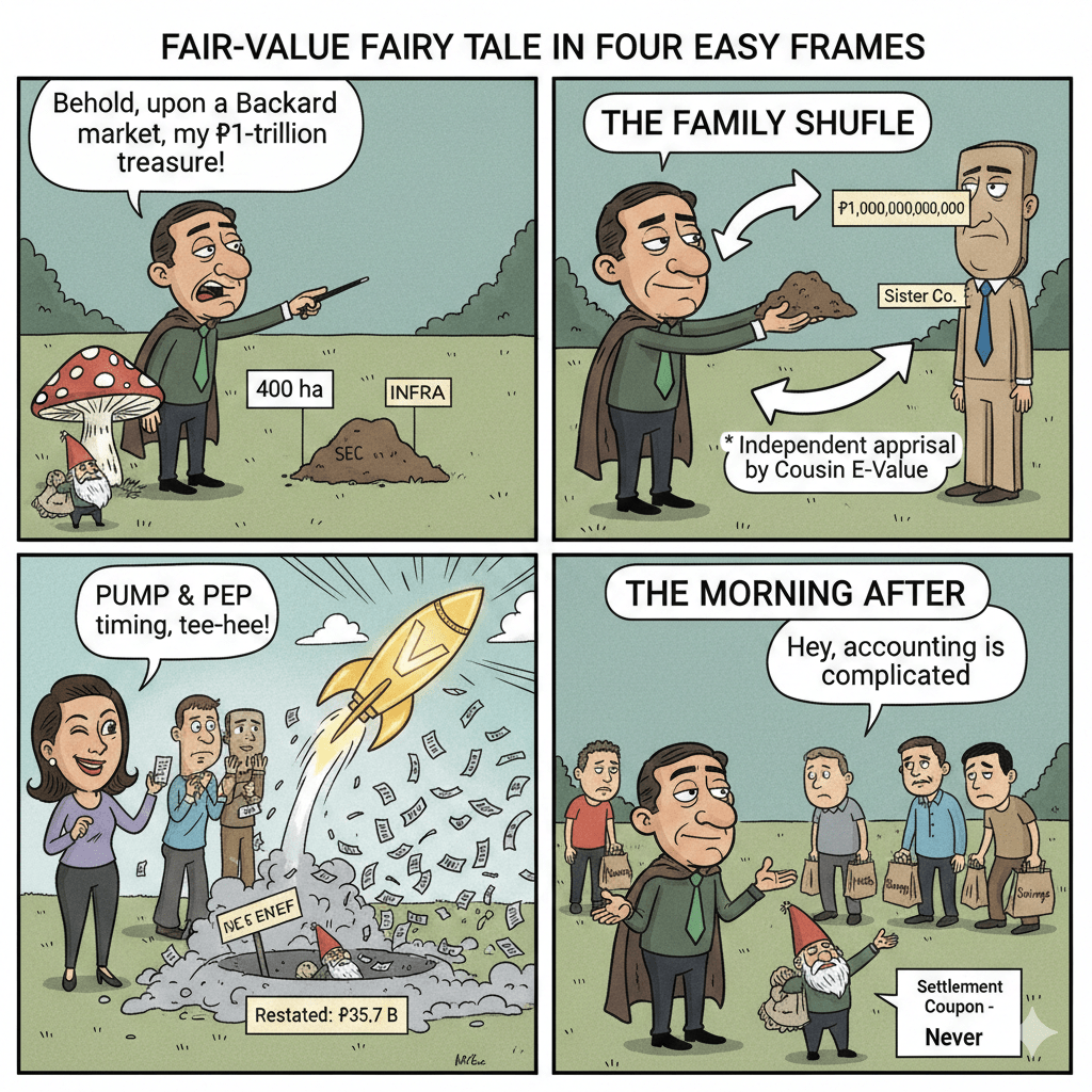 Fair value accounting under Philippine Financial Reporting Standards (PFRS) permits such revaluations, but when the buyer, seller, and appraiser are all connected, the process invites abuse. This is self-dealing elevated to an art form.