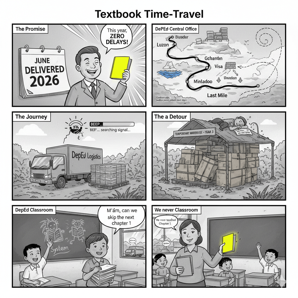 PICTURE this, mga ka-kweba: In a brightly lit stockroom in Quezon City, a property custodian in a crisp DepEd polo shirt neatly stacks thousands of brand-new textbooks, their glossy covers gleaming under fluorescent lights. A photographer from the department’s PR team snaps away—perfect for the next press release: “DepEd delivers!” the caption will crow. Meanwhile, three islands and a typhoon season away, in a sweltering classroom in Basilan, thirty-five Grade 4 students huddle around one dog-eared, ten-year-old reader, its pages yellowed and curling from the humidity. The teacher, unpaid overtime as usual, scribbles lessons on a cracked blackboard with chalk she bought herself. This, ladies and gentlemen, is the Philippines’ education system in 2026—two worlds, one bureaucracy, zero shame.