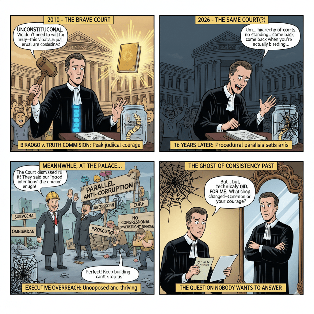 Back in 2010, when I had the honor of leading the charge in Biraogo v. Philippine Truth Commission, this very Court threw open its doors, relaxed every technicality in the book, and courageously struck down an unconstitutional monstrosity. Today? You slammed those doors shut, locked them, and swallowed the key. What a difference sixteen years makes—or perhaps what a difference the occupant of Malacañang makes.