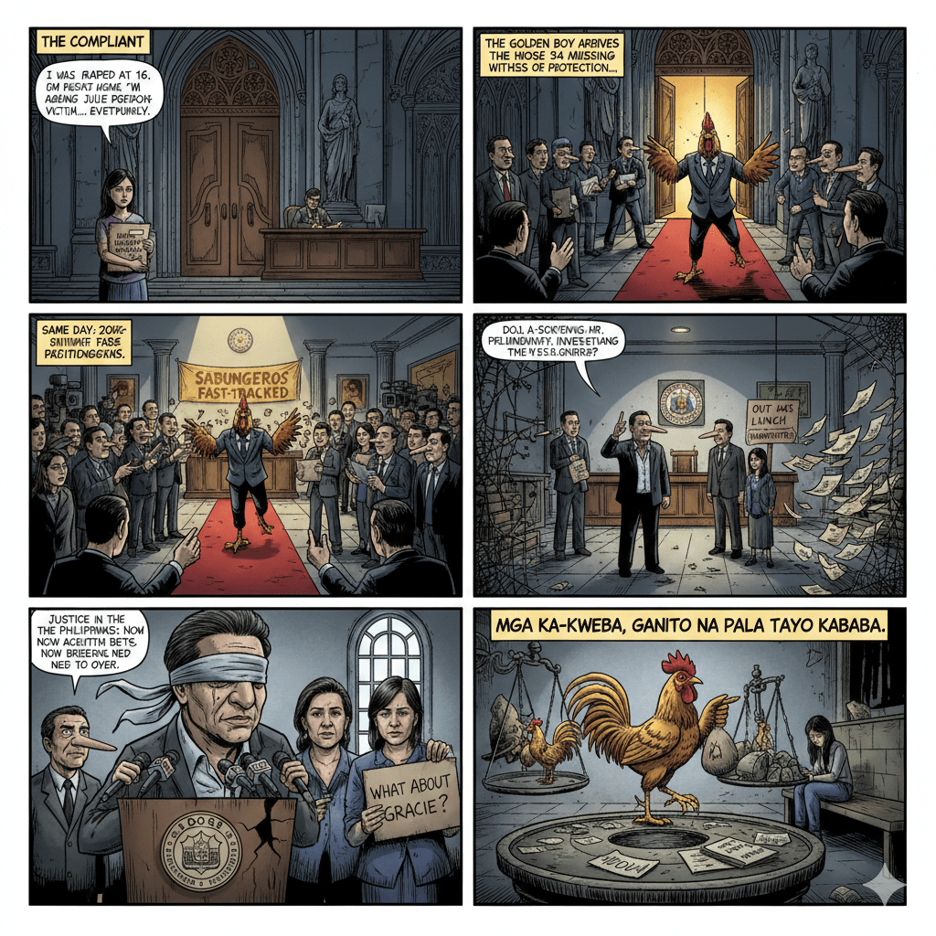 A girl raped at 16—now 21, using the pseudonym “Gracie”—alleges that Julie “Dondon” Patidongan is her attacker. Yet while her case remains stuck in preliminary investigation at the Department of Justice (DOJ), she feels she is being raped all over again—this time by the system itself. Why? Because Patidongan is the star state witness in the missing sabungeros scandal: the disappearance of at least 34 cockfighting enthusiasts, involving kidnapping, homicide, and big names like Charlie “Atong” Ang.