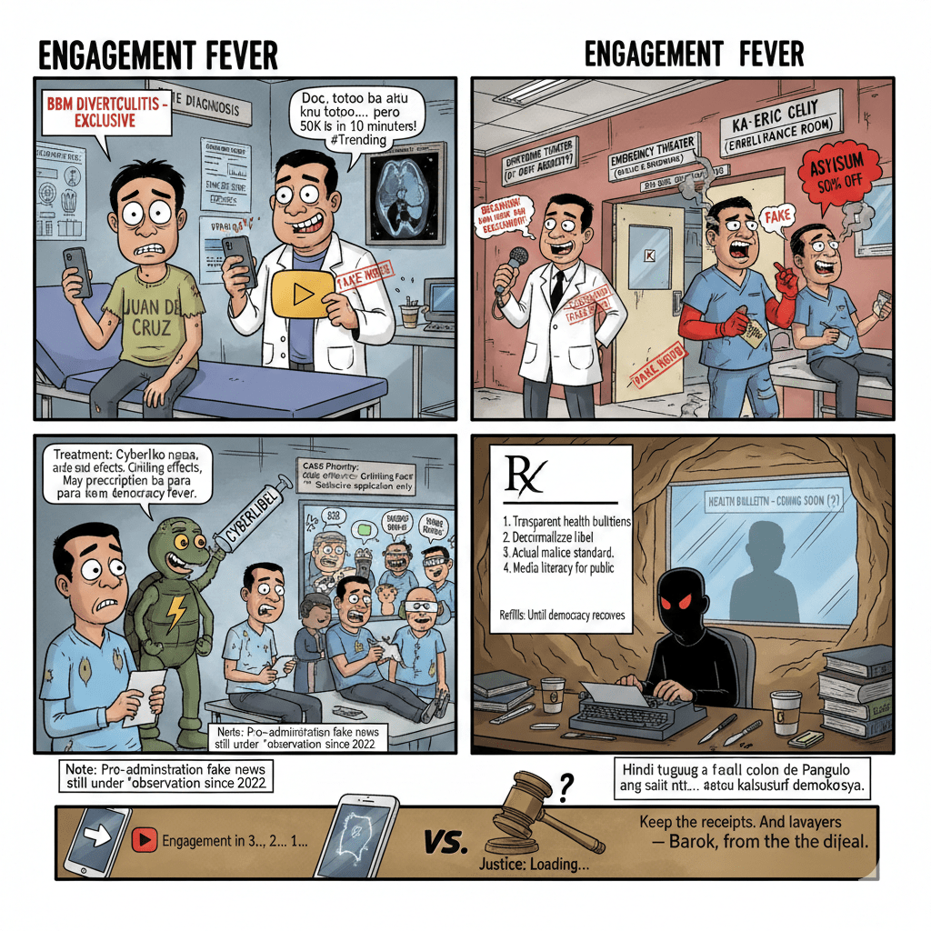 - Malacañang — Called it “fabricated and malicious.” Correct. But why more anger at the spread than at why people want to believe it? Is there opacity in health disclosures?