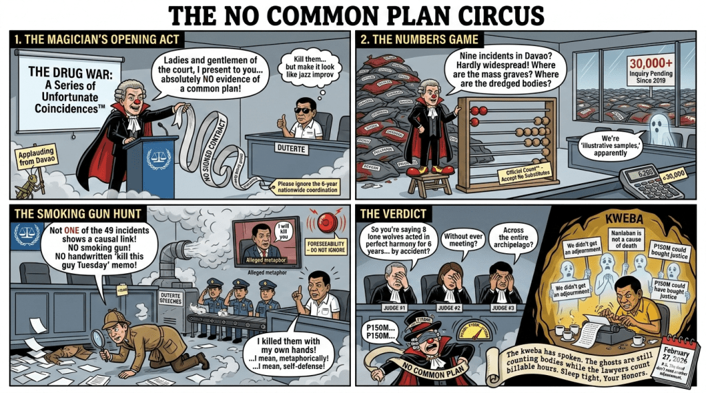 LADIES, gentlemen, and the ghosts of 30,000-plus drug-war dead, gather ‘round the virtual kweba. On February 26, 2026, Nicholas Kaufman — British-Israeli hired gun, former Jerusalem prosecutor turned ICC defense diva — strutted into the Pre-Trial Chamber like a magician pulling rabbits out of a hat that was never there. His client, the detained ex-president Rodrigo “Digong” Duterte, stands accused of crimes against humanity of murder under Article 7(1)(a) of the Rome Statute. Kaufman’s mission? Convince three judges that the entire Philippine drug war was just a series of unfortunate, unconnected oopsies with zero “common plan,” zero “widespread or systematic” character, and — cue the dramatic pause — zero smoking gun.