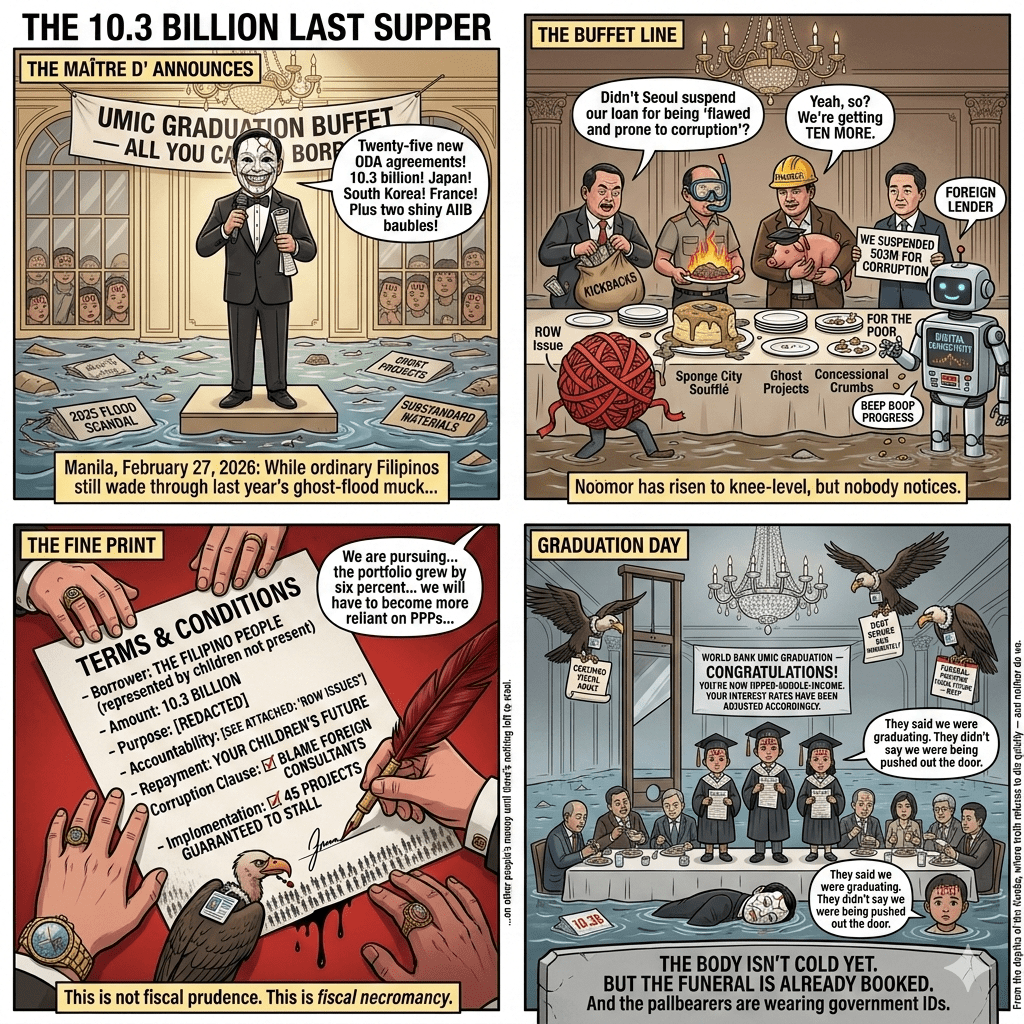 Manila, February 27, 2026: while ordinary Filipinos still wade through last year’s ghost-flood muck, Finance Secretary Frederick Go steps to the podium like a maître d’ calling last orders at the all-you-can-borrow buffet. “Twenty-five new ODA loan agreements,” he beams. “$10.3 billion from Japan, South Korea, and France. Plus two shiny AIIB baubles: half a billion for Luzon Digital Connectivity and $150 million for a Metro Manila ‘sponge city’ to retain water.”