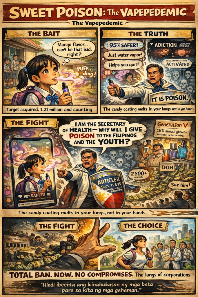 A 12-year-old girl in a Quezon City public school, backpack still slung over one shoulder, sneaks behind the canteen and takes a discreet puff from a sleek, glowing gadget. The flavor? Sweet mango or cotton-candy ube — the kind that screams “harmless fun for kids!” Her eyes light up, her young brain floods with nicotine, and she doesn’t know she just bought a lifetime subscription to addiction. Meanwhile, in air-conditioned towers, executives in designer barong tagalog clink champagne glasses. Sales are up. The “vapedemic” is booming. Their market? ₱113 million and growing at 18% a year. Their target? Our anak.