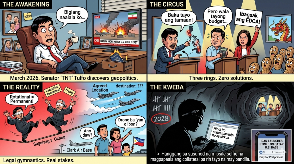 MANILA, March 2026: while Iranian proxies drone-strike U.S. bases in Qatar and Jordan, our very own Senator Erwin “TNT” Tulfo suddenly discovers that American “rotational” facilities on Philippine soil might turn us into collateral damage in a war we never signed up for.
