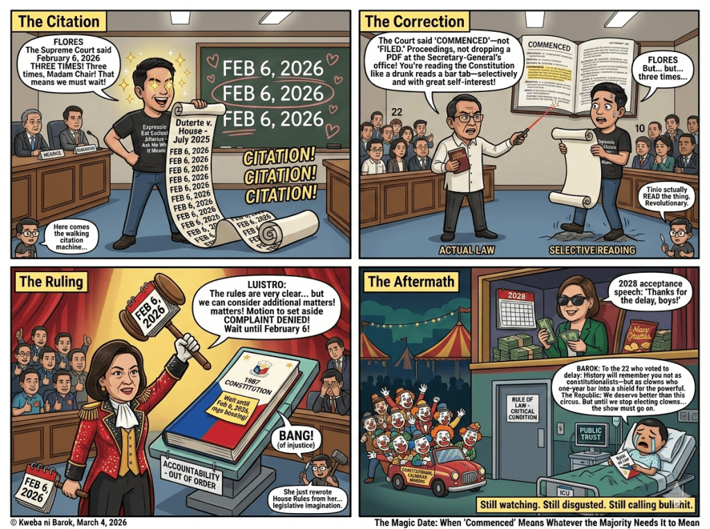 Rep. Jonathan Keith Flores (the walking citation machine) stood up, waved the July 2025 Duterte v. House decision like it was the Dead Sea Scrolls, and declared: “The Supreme Court said February 6, 2026 THREE TIMES! Expressio unius est exclusio alterius, Madam Chair!”