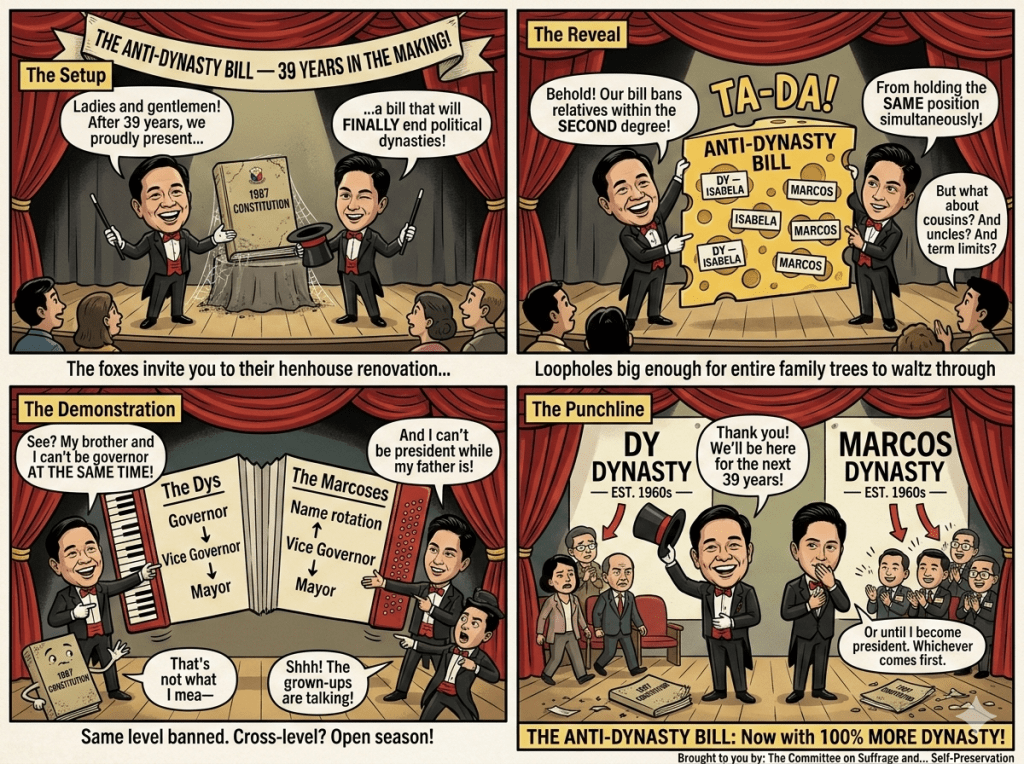BEHOLD, the sweet irony of Philippine politics: where the heirs of entrenched dynasties don the mantle of reformers, only to peddle a bill that safeguards their thrones while pretending to dismantle them. On March 3, 2026, the House Committee on Suffrage rubber-stamped an “anti-political dynasty” measure sponsored by Speaker Faustino “Bojie” Dy III and Majority Leader Ferdinand Alexander “Sandro” Marcos – a proposal so watered-down, it makes the 1987 Constitution’s mandate look like a polite suggestion rather than a command. This isn’t legislation; it’s legislative theater, a performance where dynasts play the heroes while scripting loopholes big enough for entire family trees to waltz through. As your resident caveman who’s spent years calling out this balimbing act (that’s political turncoatism for the uninitiated), I’m here to dissect this travesty with the precision of a Supreme Court dissent and the bite of a street satirist. Buckle up, mga ka-kweba – we’re about to expose how this bill isn’t just bad law; it’s constitutional sabotage.