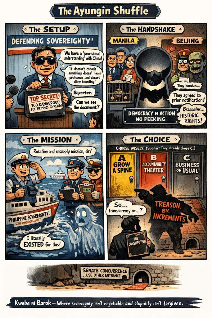 Mga ka-kweba, behold the “provisional understanding” of 2024 — a secret handshake between Manila and Beijing that has now governed thirteen rotation-and-resupply missions to the BRP Sierra Madre without a single “untoward incident,” according to DFA mouthpiece Rogelio Villanueva. The document? Still locked in a drawer. The critics? Malicious dullards who haven’t seen it. The Philippine people? Apparently too fragile to handle the truth.