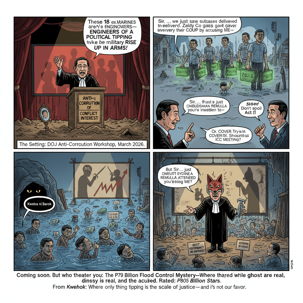 THE Kweba echoes with the drip of forgotten truths, but today it roars. As we mark another EDSA anniversary—where people once toppled a dictator only to birth a system that perfected the art of plunder—the nation is treated to yet another spectacle: Ombudsman Jesus Crispin “Boying” Remulla, perched at the Department of Justice‘s anti-corruption workshop, ambushed by reporters for his latest pronouncement. Eighteen alleged ex-Marines, he declares, aren’t whistleblowers exposing the mother of all kickback schemes. No, they’re engineers of a “political tipping point,” scheming to prod a branch of the Armed Forces of the Philippines (AFP) to “rise up in arms.”
