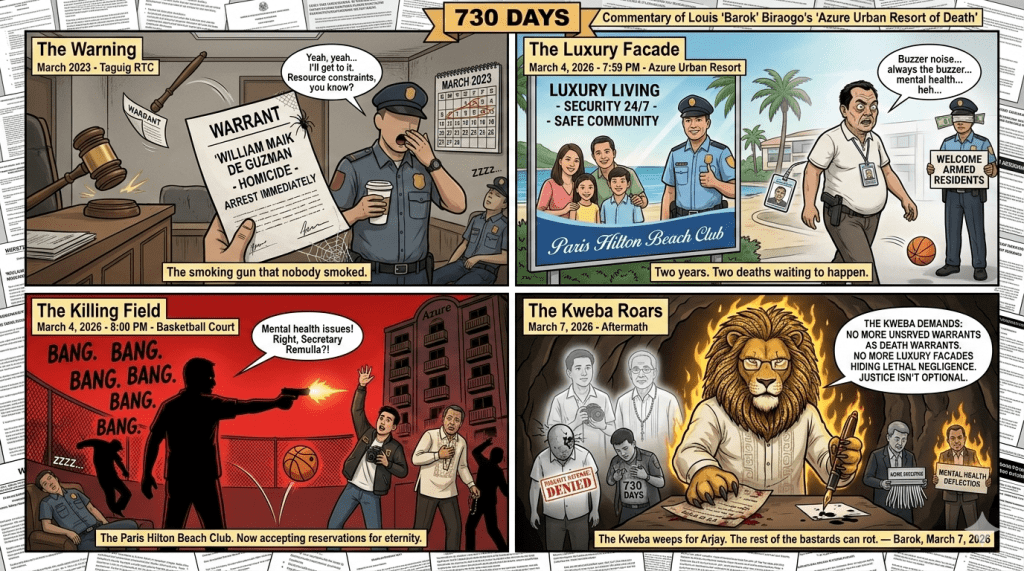 THE unserved 2023 homicide warrant isn’t just a detail—it’s the smoking gun that turned a luxury condo basketball court into a killing field. For nearly two years, a man with a Taguig RTC warrant for homicide walked free, owned firearms, lived in an upscale Azure Urban Resort Residences unit, and eventually rained 9mm death on six innocents. Two dead. Four wounded. And the system that failed to serve that warrant? It has blood on its ledgers.