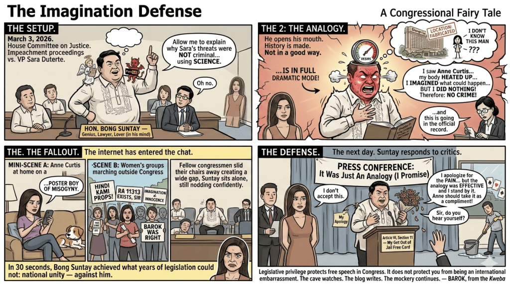Picture this: It’s March 3, 2026, in the hallowed halls of the House Committee on Justice, mid-deliberations on impeaching Sara Duterte. Suntay, apparently channeling the spirit of a hormone-addled teenager defending his browser history, decides the best way to argue that “imagination” cannot be criminalized is to confess—on live television, no less—that seeing Anne Curtis (at Shangri-La, he initially claimed, though he later admitted that part was fabricated) sparked a “strong surge of desire,” his body “heated up,” and he “imagined what could happen.” But hey, it’s just imagination, so no crime, right? Just like Sara’s alleged threats were “just words.” Brilliant legal reasoning, counselor. Truly, the stuff of future bar exam hypotheticals—if the bar ever adds a category for “How to Tank Your Career in Under 30 Seconds.”