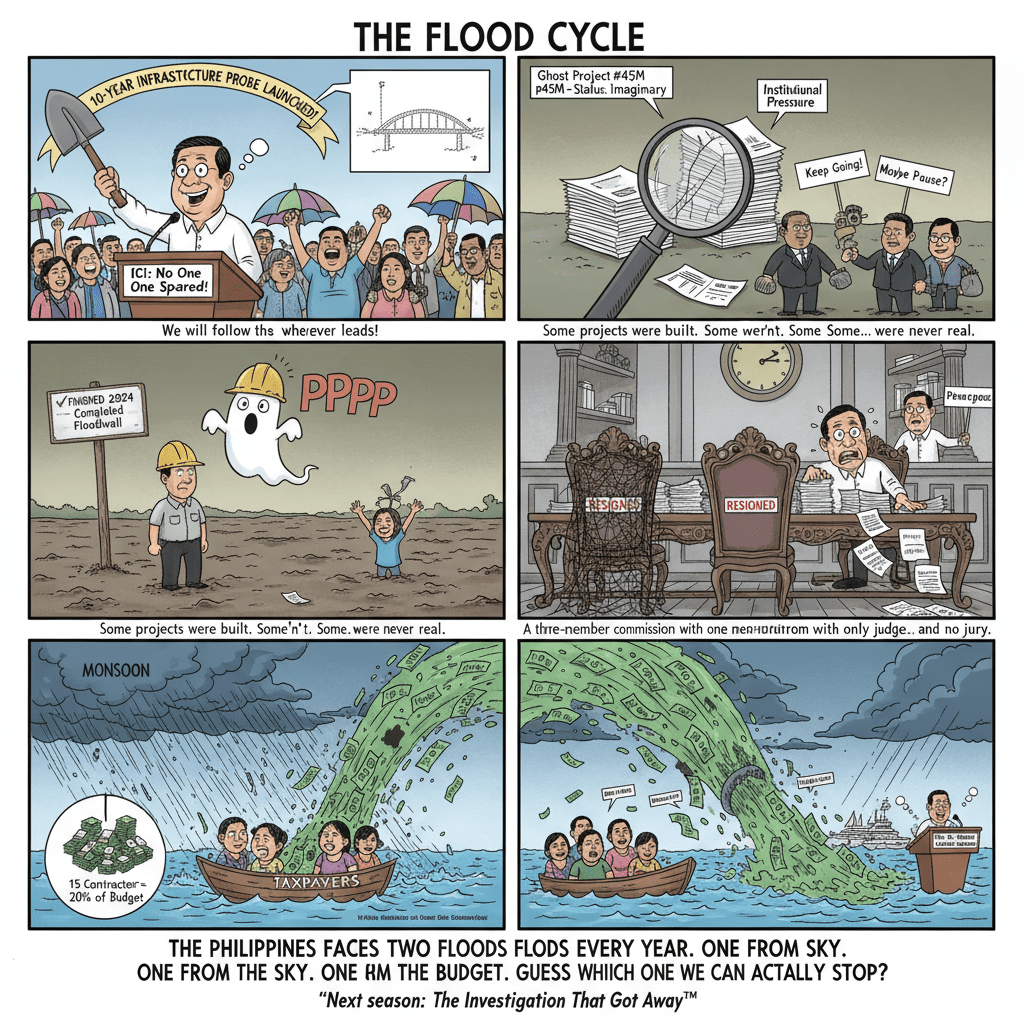 Every year it arrives predictably: monsoon rains, swelling rivers, submerged streets, children wading through brown floodwater. What arrives less predictably—but just as regularly—is the discovery that billions of pesos meant to stop those floods have vanished.