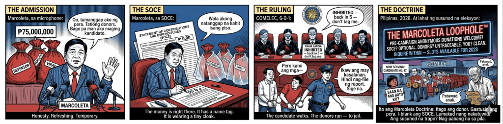 Election integrity? Gutted. Public trust in COMELEC? Lower than a snake’s belly. Political landscape? Now officially for sale to shy billionaires. Legal precedent? A loaded gun pointed at every future SOCE. Campaign finance? Officially optional.