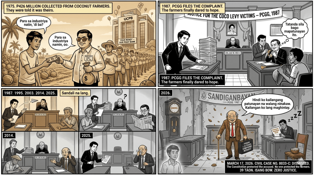 WELL, well, well. Another “ill-gotten wealth” case bites the dust—not because the Marcos-era cronies proved their innocence, but because the Philippine government proved, once again, that it is constitutionally incapable of tying its own shoelaces in under four decades. On March 17, 2026, the Sandiganbayan 2nd Division quietly euthanized Civil Case No. 0033-C, the last surviving fragment of the 1987 coco levy complaint that once dragged in Ferdinand Marcos, Imelda, Danding Cojuangco, Juan Ponce Enrile, and the rest of the coconut mafia. The remaining defendants— Enrique M. Cojuangco, Marcos O. Cojuangco, Rafael Abello, and Agricultural Investors Inc.—walk away laughing while the actual victims, the coconut farmers who were fleeced to the tune of P426 million (now worth billions in today’s pesos), get to keep their generational poverty as a souvenir.
