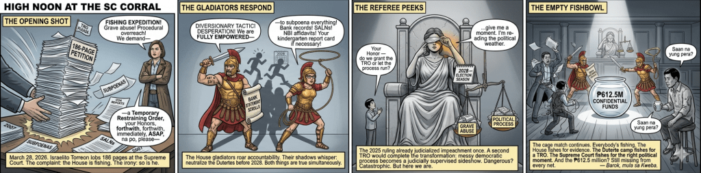 MGA ka-kweba, ladies and gentlemen of the Republic, welcome to the latest episode of Philippine Politics: High Noon at the Supreme Court Corral. The House of Representatives is revving its impeachment engine for the third and fourth time against Vice President Sara Duterte. Pro-Duterte lawyer Israelito Torreon has just lobbed a 186-page certiorari-and-prohibition grenade at the Supreme Court, complete with a desperate prayer for a Temporary Restraining Order. The charge? The House Committee on Justice is running a “fishing expedition” to cure fatally defective complaints.