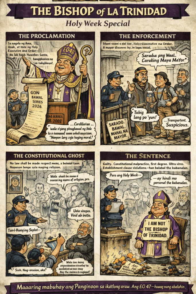 It is the judgment of this Court that Executive Order No. 47, Series of 2026, be consigned to the bonfire of vanities — right next to every other pious decree that mistook a gavel for a crosier. The Mayor is hereby sentenced to 40 days of remedial constitutional law, to be served in the public square, wearing a sandwich board that reads: “I am not the Bishop of La Trinidad.”