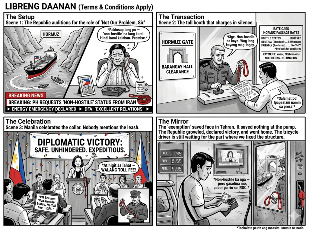ISIPIN niyo ito, mga ka-kweba: a harried Philippine diplomat in Tehran’s corridors, rosary beads clicking like a Geiger counter, whispering “non-hostile, po” while an IRGC speedboat idles nearby, its crew waving a Philippine-flagged tanker through the Strait of Hormuz the way a barangay tanod waves a tricycle past a flooded intersection—grudging, amused, and fully aware it can revoke the favor with one radio call.