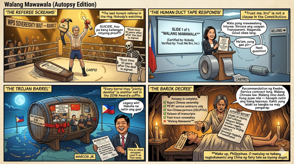 I WARNED you in “From Arbitration Victory to Humiliation Deal: Why This China Gas Pact Stinks” — the Marcos administration was sleepwalking toward sovereign seppuku in the West Philippine Sea. April 2026 has arrived, and the nightmare is real: Antonio Carpio is screaming “suicide,” Claire Castro is chanting “walang mawawala” like a mantra, and the Palace is busy treating the 2016 Arbitral Award like yesterday’s embarrassing Facebook memory.