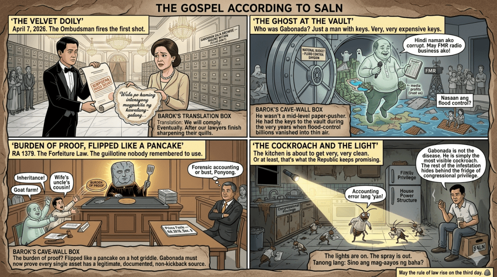 This subpoena is not the end. It is merely the opening hymn in the Gospel According to SALN. Gabonada is not the disease—he is simply the most visible cockroach scuttling across the kitchen floor while the rest of the infestation hides behind the fridge of congressional privilege. The lights are on. The spray is out. And the kitchen, ladies and gentlemen, is about to get very, very clean. Or at least, that’s what the Republic keeps promising every time the floods rise again.