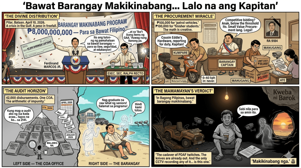 LADIES and gentlemen of the jury—er, readers—picture this: the Middle East is on fire, the peso is doing its best impression of a lead balloon, and suddenly, like manna from heaven wrapped in a Malacañang press release, the Marcos administration rolls out the Bawat Barangay Makinabang Program—BBM for short, because of course it is. President Ferdinand R. Marcos Jr. himself spearheaded the distribution in Pilar, Bataan, handing ₱8 billion in crisp taxpayer cash to 42,000 barangays at a cool ₱200,000 apiece. Half for “street lights, patrol vehicles, CCTV cameras, and power generators.” The other half for a “finisher program” to save college seniors from dropping out.