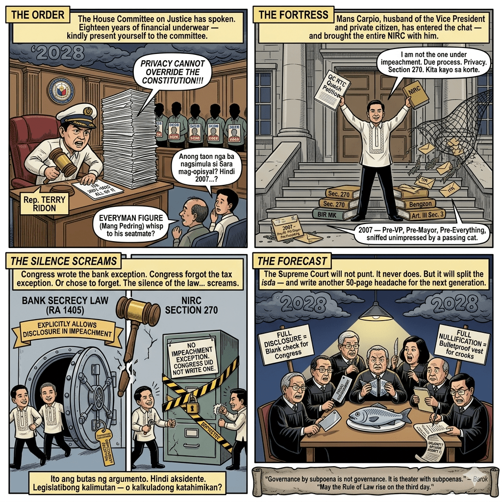 Carpio’s petition is surgically precise. He is not a party to the impeachment. He received no personal notice. The ITRs are statutorily sacrosanct under Republic Act No. 8424 (National Internal Revenue Code) Section 270: unlawful for BIR officers to divulge taxpayer information except in cases provided by law. Note the absence of any impeachment carve-out — unlike the Bank Secrecy Law (Republic Act No. 1405 (The Law on Secrecy of Bank Deposits), as amended), which explicitly permits disclosure “in cases of impeachment.” Congress wrote that exception for banks but conspicuously omitted it for taxes. That silence screams.