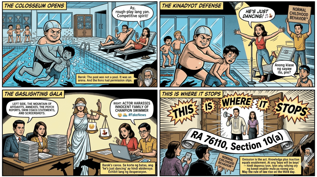 The legal stakes? Not mere “boys will be boys” playground scrapes, but a full-blown criminal complaint under Section 10(a) of Republic Act No. 7610 (Special Protection of Children Against Abuse, Exploitation and Discrimination Act) for creating “conditions prejudicial to the child’s development.” Vargas and company have drawn the line in the chlorinated water with their now-famous battle cry: “This is where it stops.” Indeed, Barok says—before the defense counsel starts drafting motions to dismiss and the rest of us watch this case turn the Family Code into the latest spectator sport.