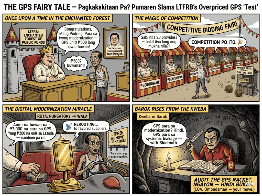 MGA ka-kweba, listen to this procurement fairy tale straight from the LTFRB’s enchanted forest of public funds. Congressman Donato Pumaren drops the bomb: ₱500 a month for a GPS device that’s “just a test.” One-time market alternatives? A measly ₱300. Do the math, kabayan. That’s not a device rental — that’s a sophisticated monthly subscription to the Great Philippine Heist. In six months alone, one operator shells out ₱3,000 for what could have been bought outright for ₱300. Multiply that by thousands of PUVs in the service contracting program and you’re looking at millions funneled into… what? “Data transmission and monitoring systems”? Please. My COA auditor soul is already vomiting.